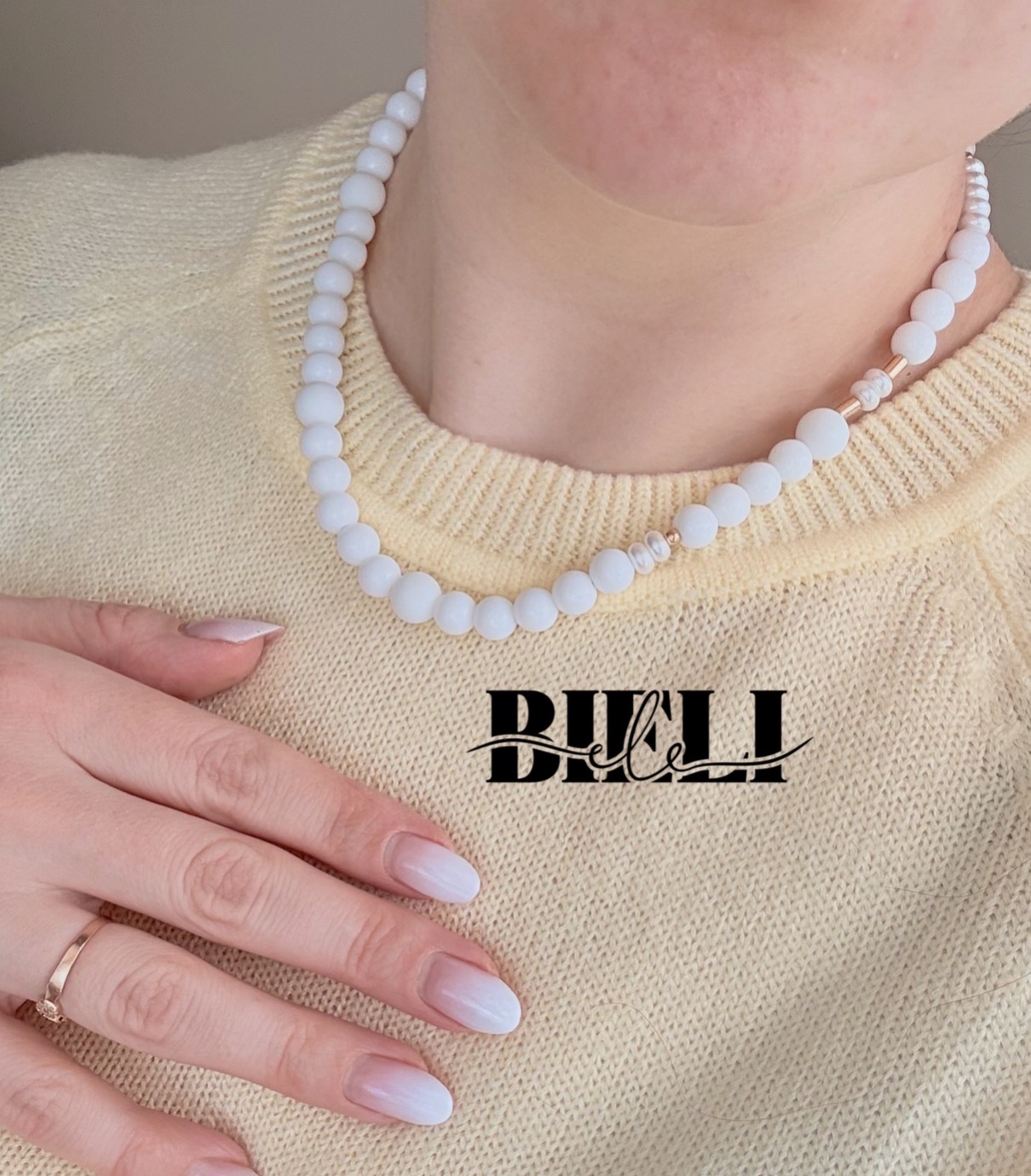 Baltas stiklo karoliuku vėrinys, su perlo intarpais, aukso detalėmis